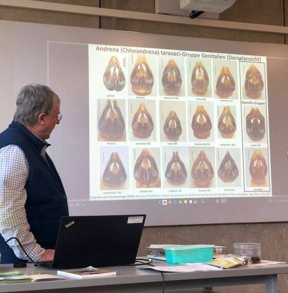 Unser Gesellschafter und Mitarbeiter Hans Schwenninger erklärt in einem Bestimmungskurs die Merkmale zur Bestimmung von Andrena-Männchen der A. taraxaci-Gruppe, die er wissenschaftlich revidiert und aus der er mehrere Arten beschrieben hat.