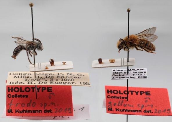 Unser Gesellschafter Michael Kuhlmann hat 2019 die Männchen der beiden Seidenbienenarten erstmals wissenschaftlich beschrieben. Er benannte die beiden Wildbienenarten „Colletes frodo" bzw. „Colletes gollum". An dem meist auffällig roten Etikett mit entsprechender Beschriftung sind Holotypen eindeutig erkennbar. Holotypus bedeutet, dass dieses Exemplar – und nur dieses einzige Tier – der verbindliche Namensträger und damit gleichsam das „Urmeter" einer neu beschriebenen Art ist.